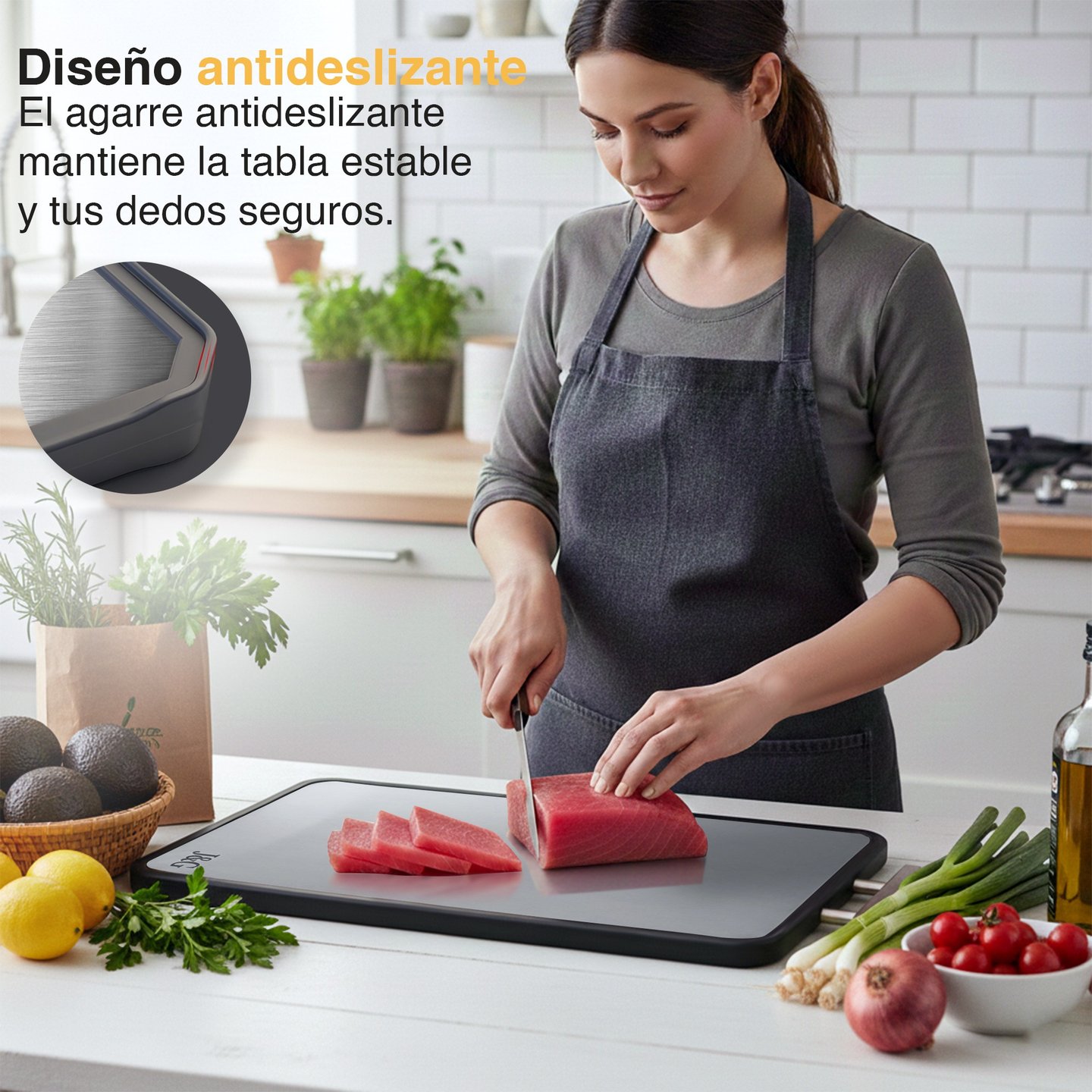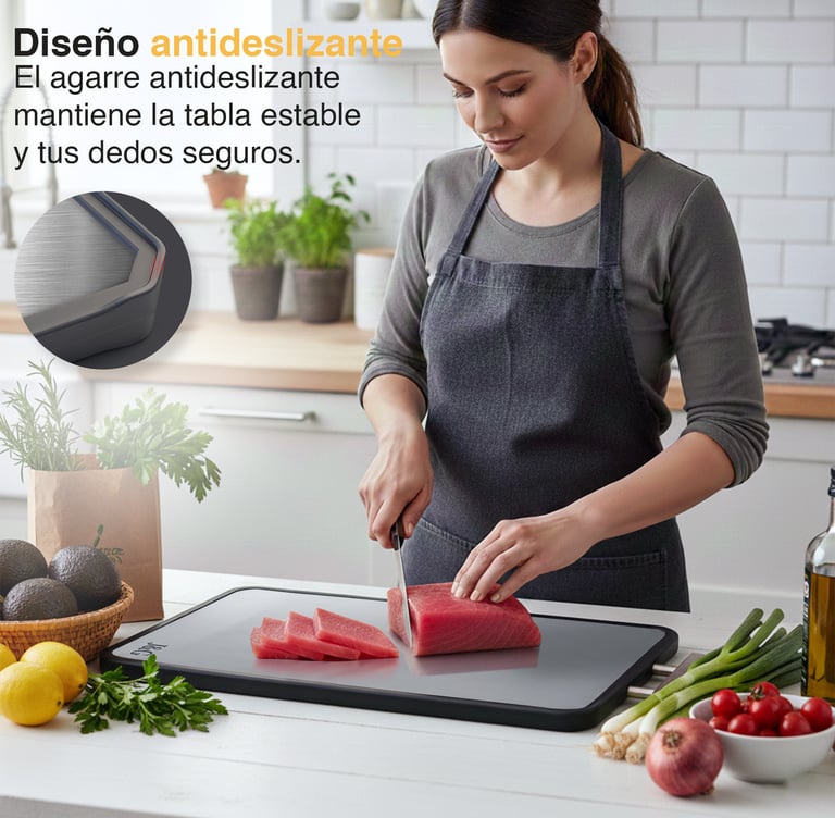 Su estructura no porosa evita la absorción de líquidos y olores, ayuda a mantener tus cuchillos en buen estado y ofrece un entorno de preparación más limpio para tus alimentos.